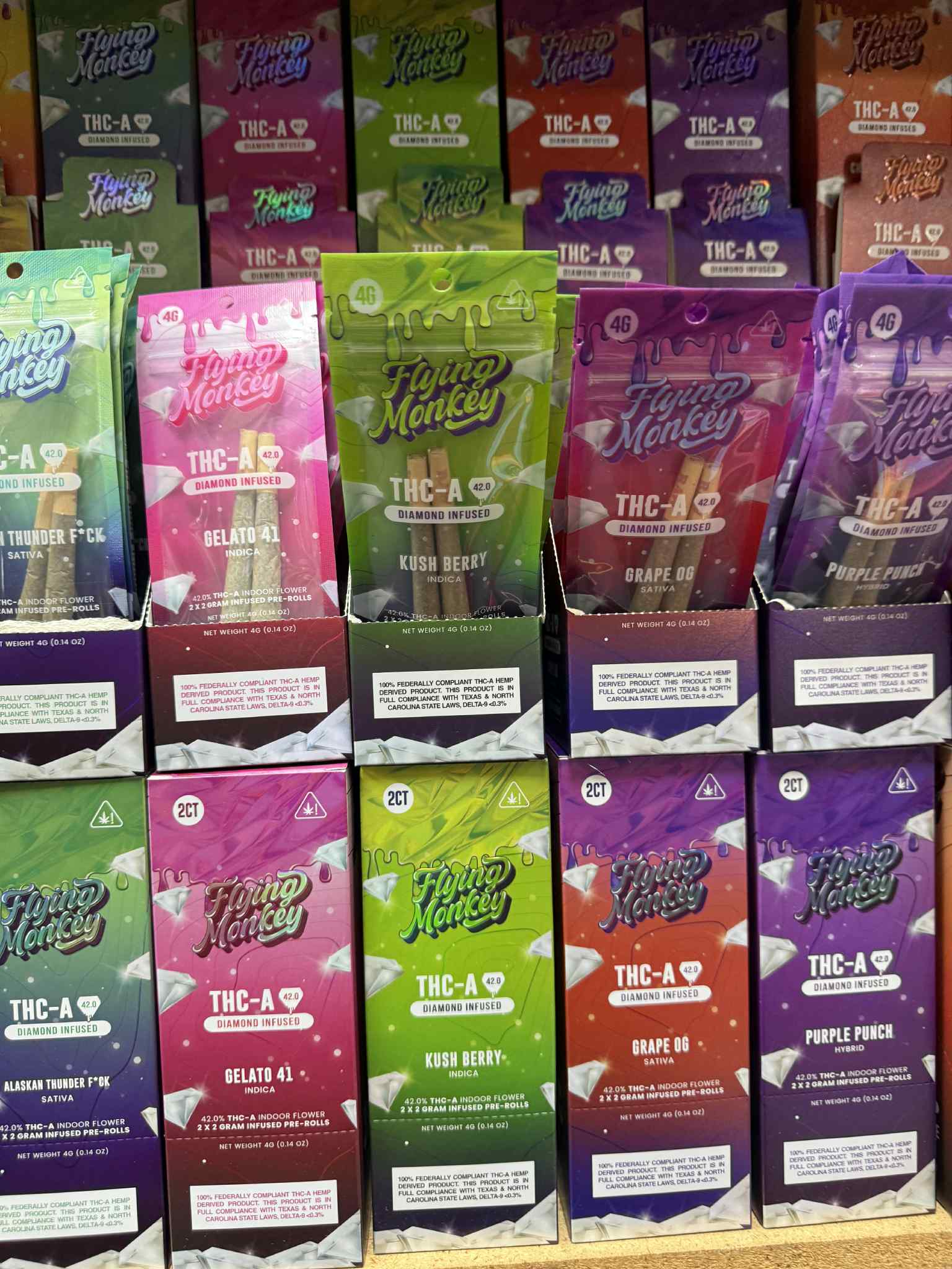 FLYING MONKEY THC-A BOUTIQUE PRE-ROLLS | 2 CTINDOOR FLOWER 2 COUNT PER PACK 4G 55% THC-A INDOOR FLOWER 2 X 2 GRAM INFUSED PRE-ROLLS DIAMOND INFUSED PRE-ROLLS AVAILABLE IN DIFFERENT STRAINS !